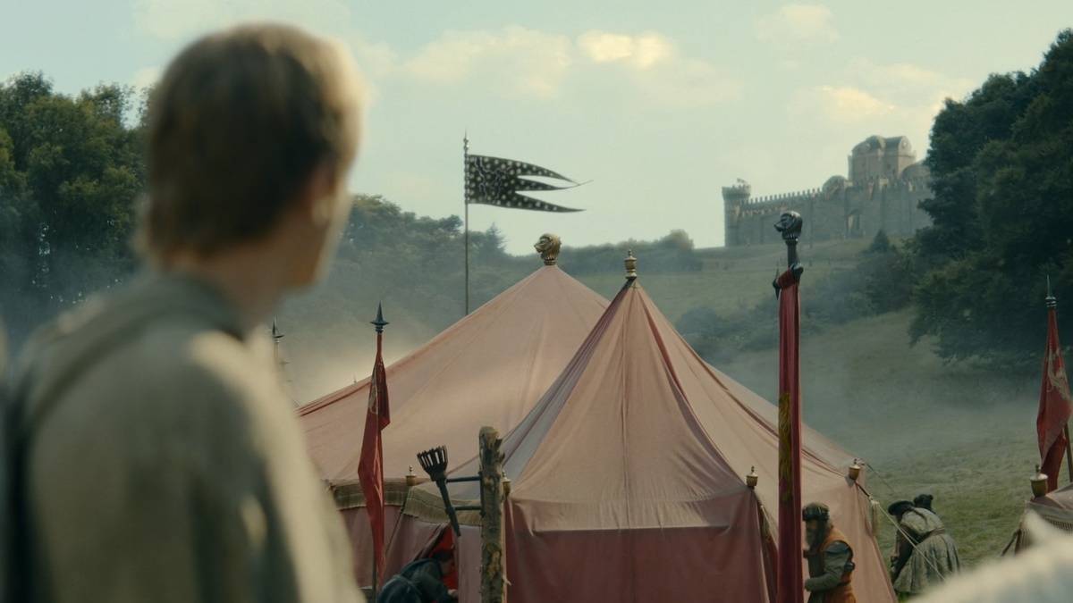 再往远处看,还能瞥见兰尼斯特家族标志性的绯红帐篷。这个视觉符号在无声地提醒观众:凯岩城的狮子们,就在附近不远。